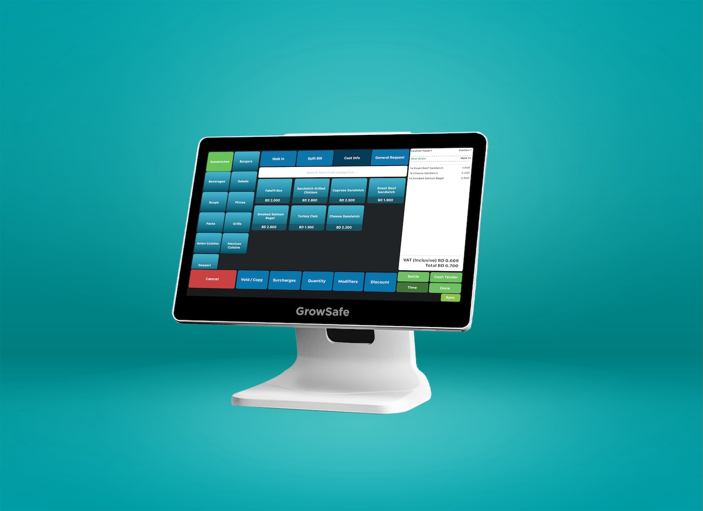 - GrowSafe Kiosk: Ideal for self-service setups, this solution can be mounted on the wall, placed flat on the counter, or mounted on a floor stand. It is perfect for quick checkouts, order taking, or payments without the need for a cashier.